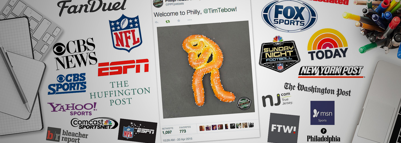 In April 2014 (just days before National Pretzel Day), Tim Tebow was traded to the Philadelphia Eagles — and the No Limit Agency social media and PR teams quickly devised a strategy and took action to capitalize on the news of this media darling joining its hometown team. The Philly Pretzel Factory team had created a Tim Tebow pretzel that No Limit Agency then turned into a shareable image congratulating Tebow on the trade from Philly Pretzel Factory. The tweet spread quickly, gaining the attention of ESPN, the NFL and Sports Illustrated. @PPFPretzels was flooded with requests to use the photo across many different media platforms. The momentum only increased throughout the day, as ESPN and the NFL both tweeted out the photo themselves with a credit to Philly Pretzel Factory. The No Limit Agency PR team leveraged this news to blow out National Pretzel Day and secured coverage on FOX & Friends, The Today Show (twice!), CNBC, CBS Evening News, People magazine, Sports Illustrated and 1,800 other media outlets over 24 hours.